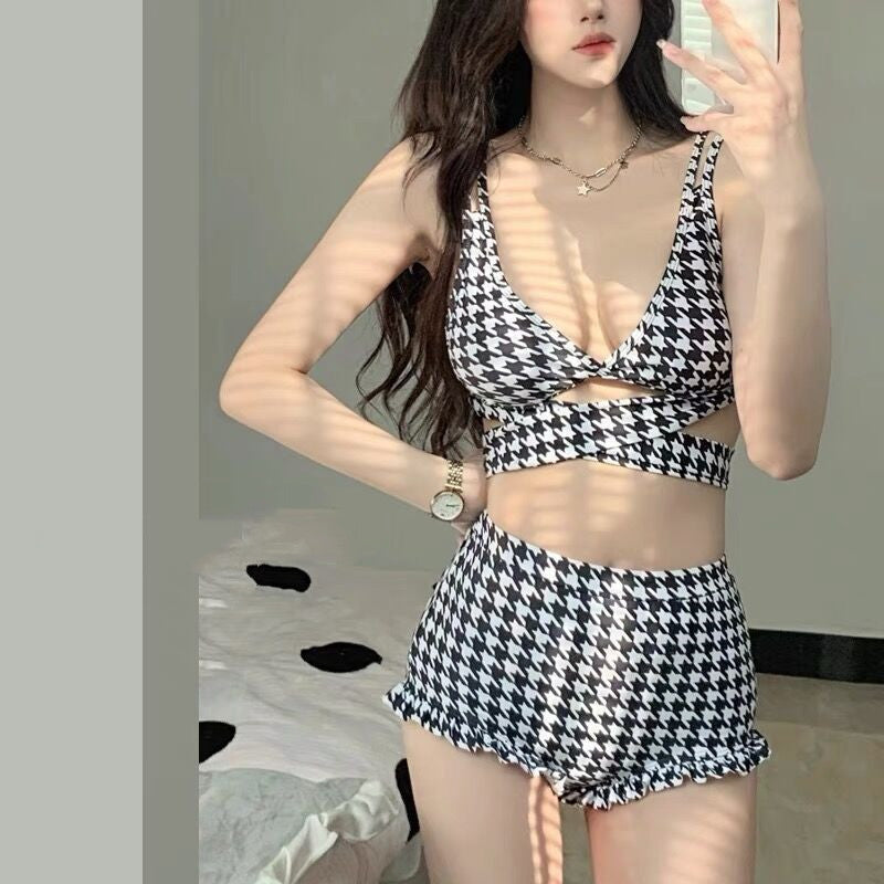Houndstooth Lace/Triangle Hollow-Out Plaid Lace-Up Back Women's Criss-Cross Bikini Swimsuit