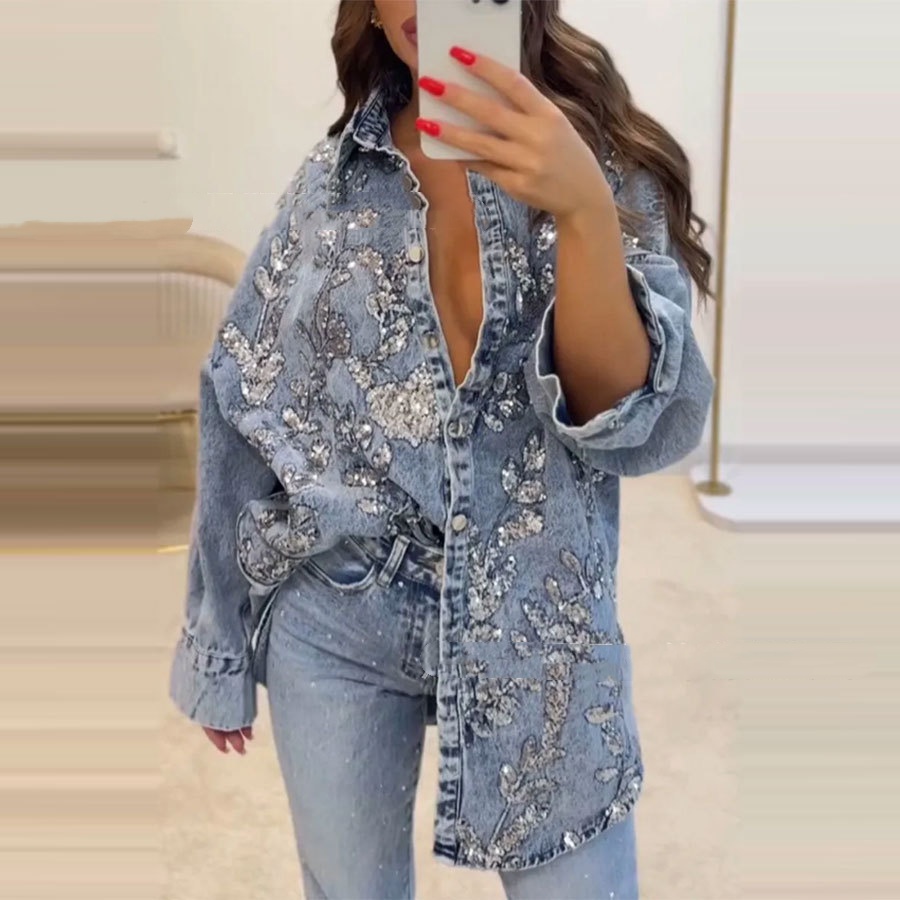 Denim Silver Metallic Floral Design Women's Long Sleeve Denim Jean Jacket to 5X Plus Size