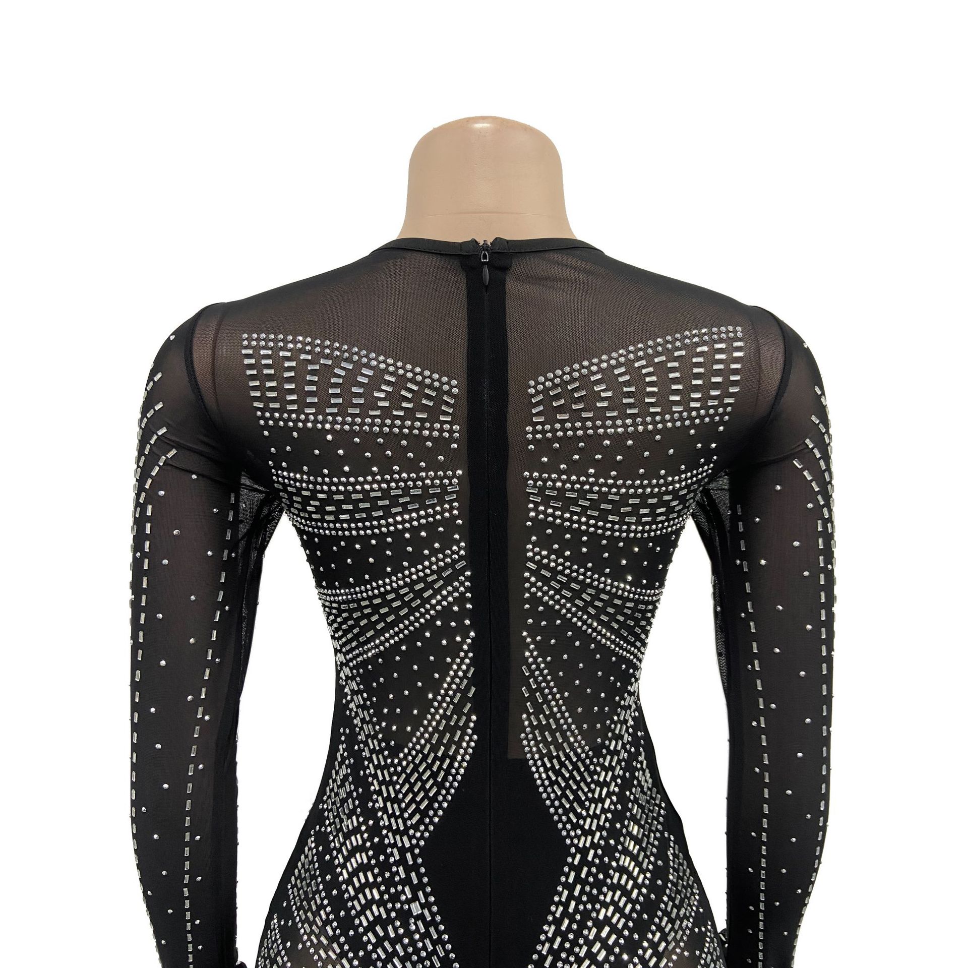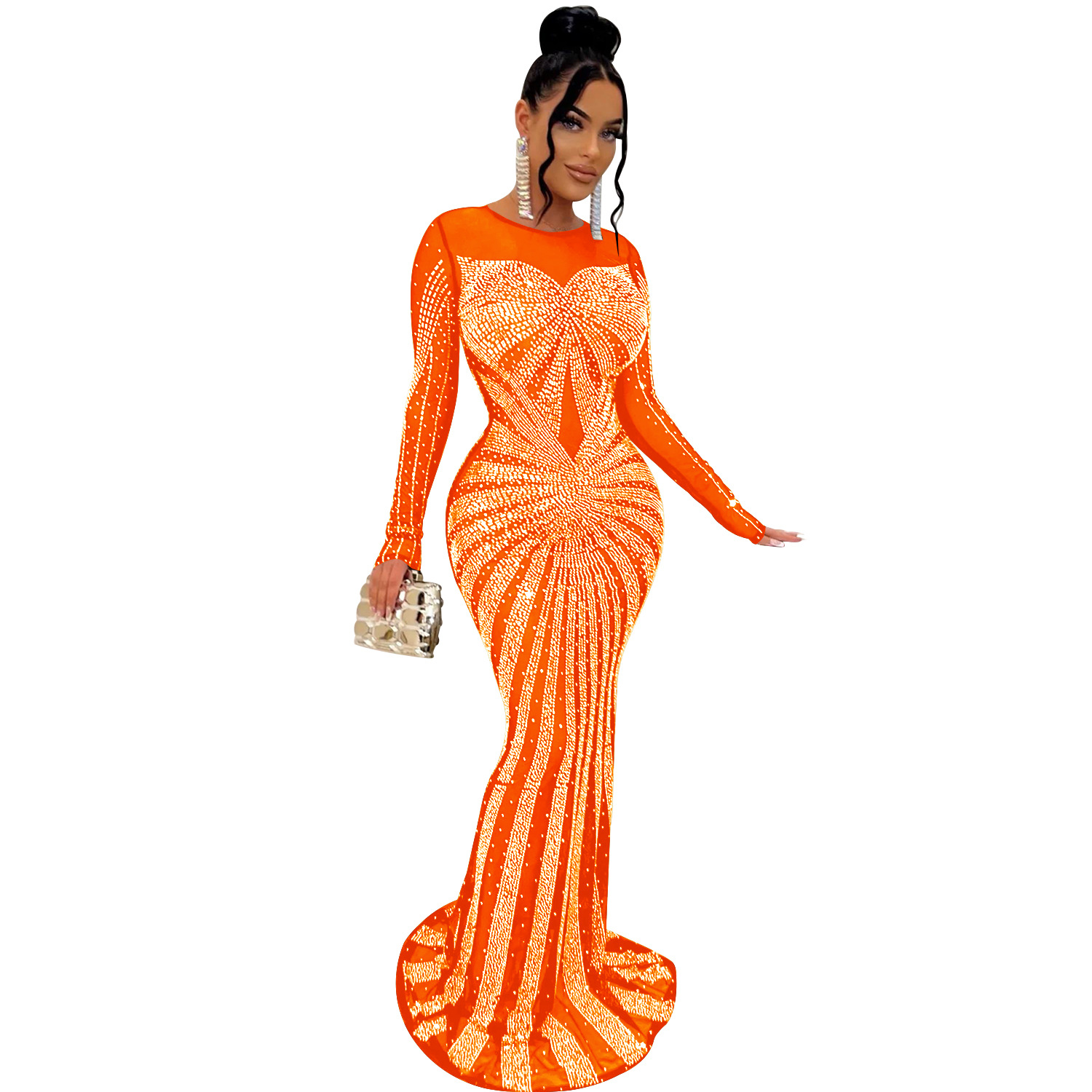 Metallic Hot Drill Rhinestone Sparkling Glitter Transparent Mesh Sheer Long Sleeve Formal Floor-Length Dress