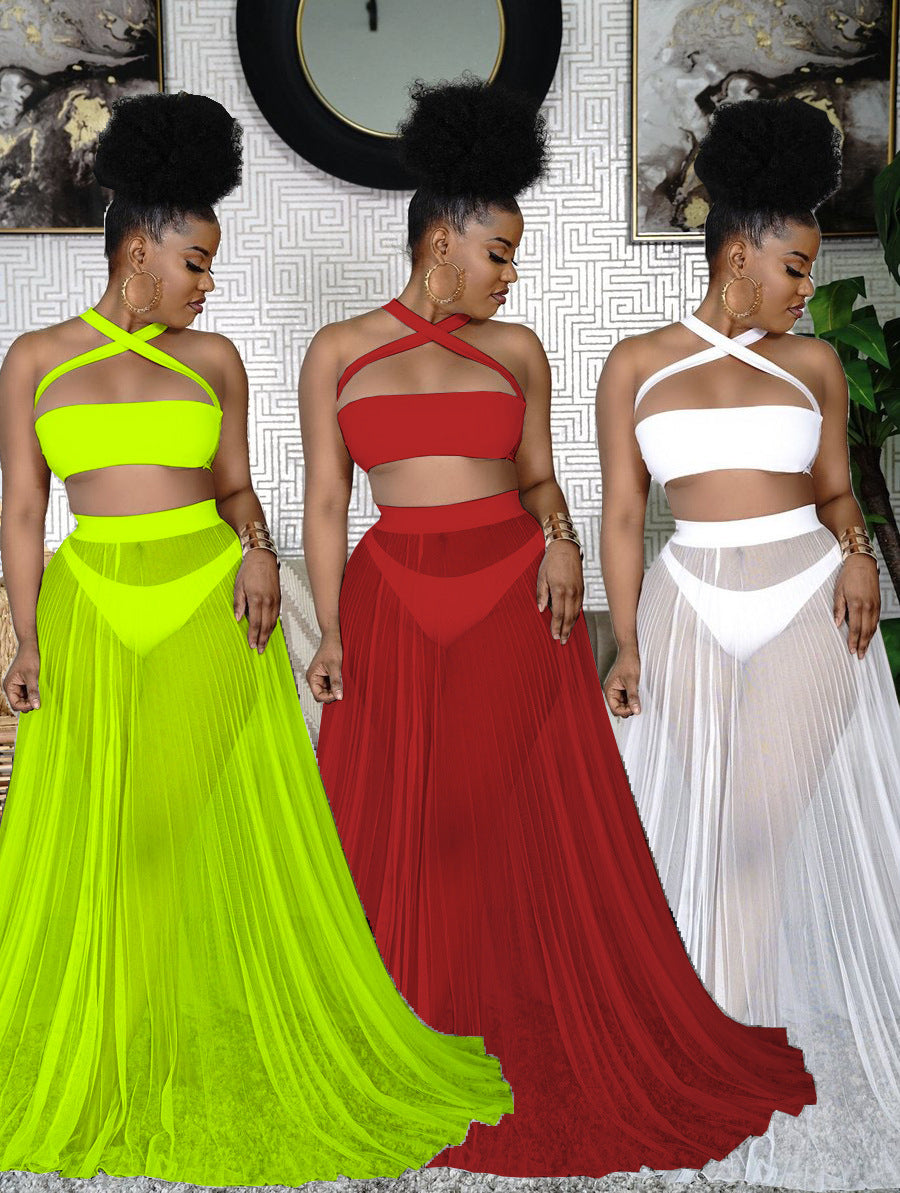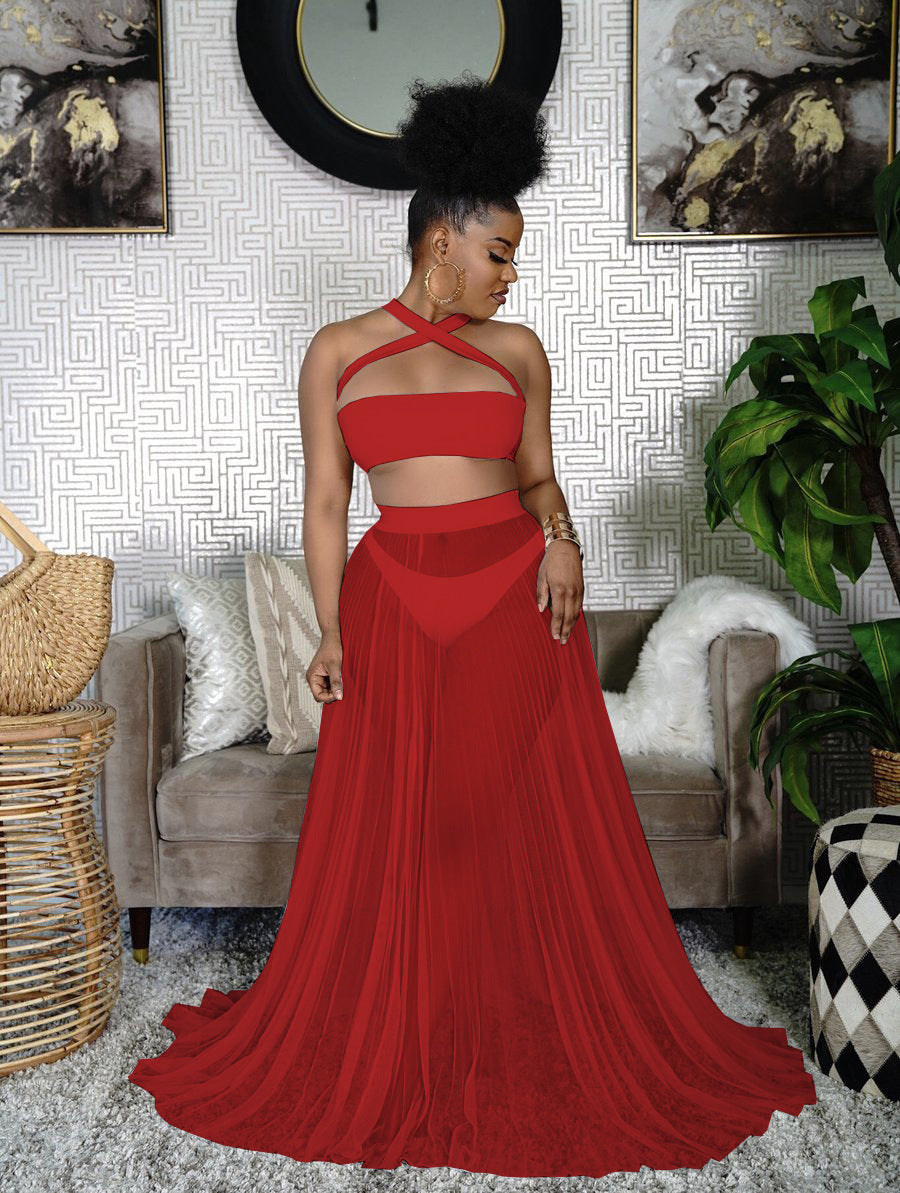 Criss-Cross Strap Bikini Swimsuit+ Mesh Transparent Flowing Maxi Skirt + 3-Piece Swimwear Cover-Up Set